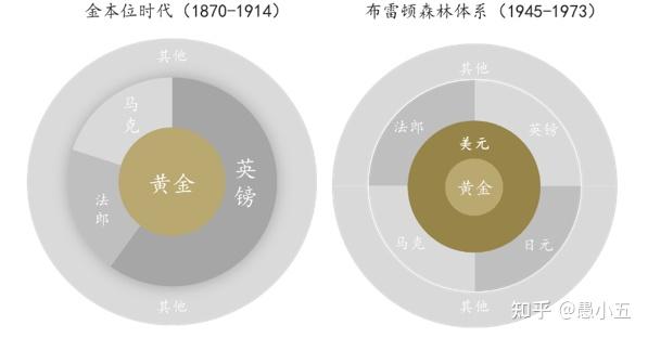 从此历史迎来了布雷顿森林体系下的国际货币体系,通过美元与黄金挂钩,美元正式成为了世界储备货币。下面有张图,大家可以看看,理解金本位制和布雷顿森林体系体系之间的区别。